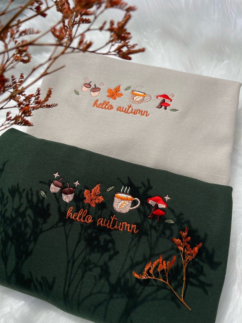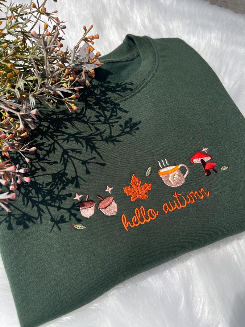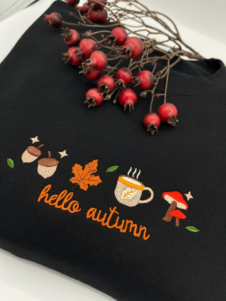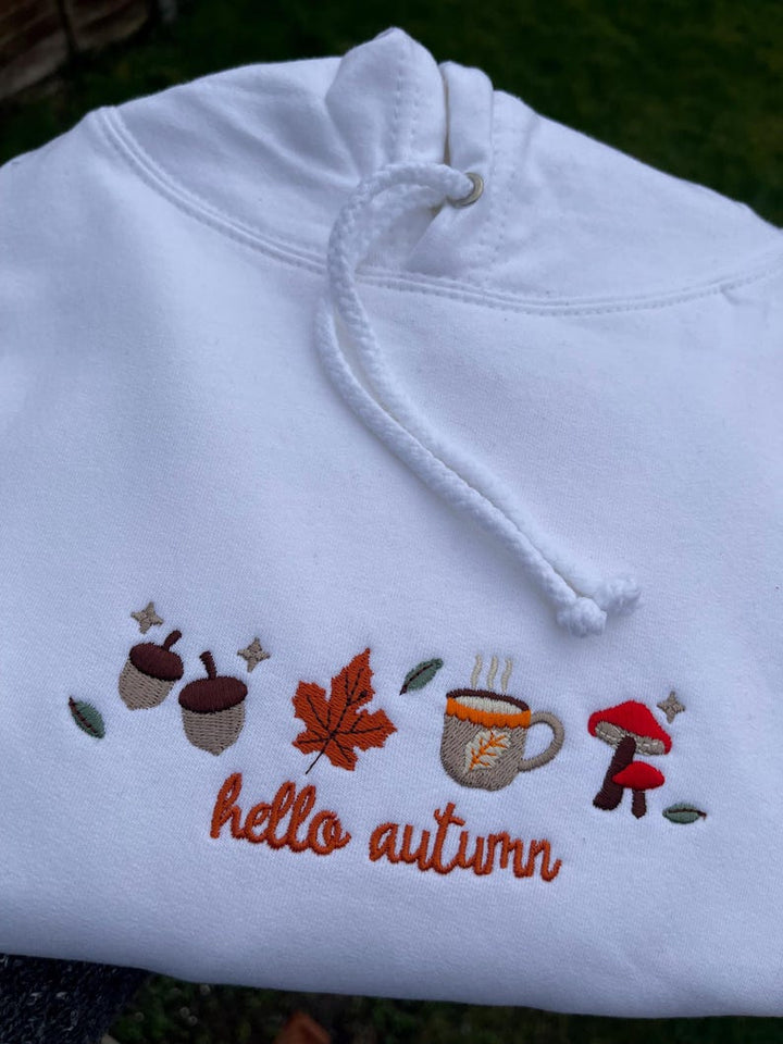 Cozy "Hello Autumn" Embroidered Falling Leaves Sweatshirt Hoodie